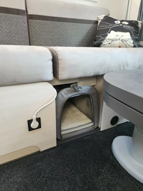 Um den Katzen einen Rückzugsort zu bieten, haben wir zwei Transporttaschen angeschafft, die ideal unter den Sitzbänken platziert werden können. Obwohl auf beiden Seiten Stauraum verloren geht, ist es dennoch wichtig, dass sich auch die Katzen in ihrem Zuhause wohlfühlen.